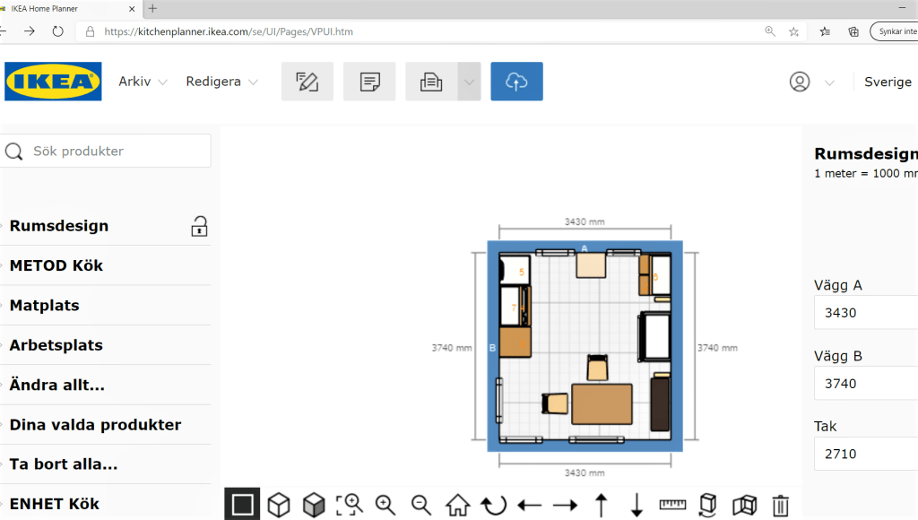 Så inspirationen flödar och lyckligtvis har IKEA ett föredömligt och gratis verktyg man kan använda; IKEA Homeplanner. Vårt regelverk för hållbara val i projektet är: 1. återanvänd 2. köp begagnat 3. köp miljömärkt och om inget av detta är möjligt 4. köp från IKEA (som har ett robust om än icke perfekt hållbarhetsarbete) så vi börjat att designa i detta verktyg.