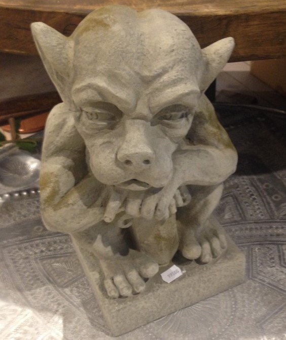 När vi förhoppningsvis under hösten färdigställer bottenvåningen kommer vår fina vakthund som det nästan bär emot att kalla grotesk, att ta hand om bevakningen inomhus.