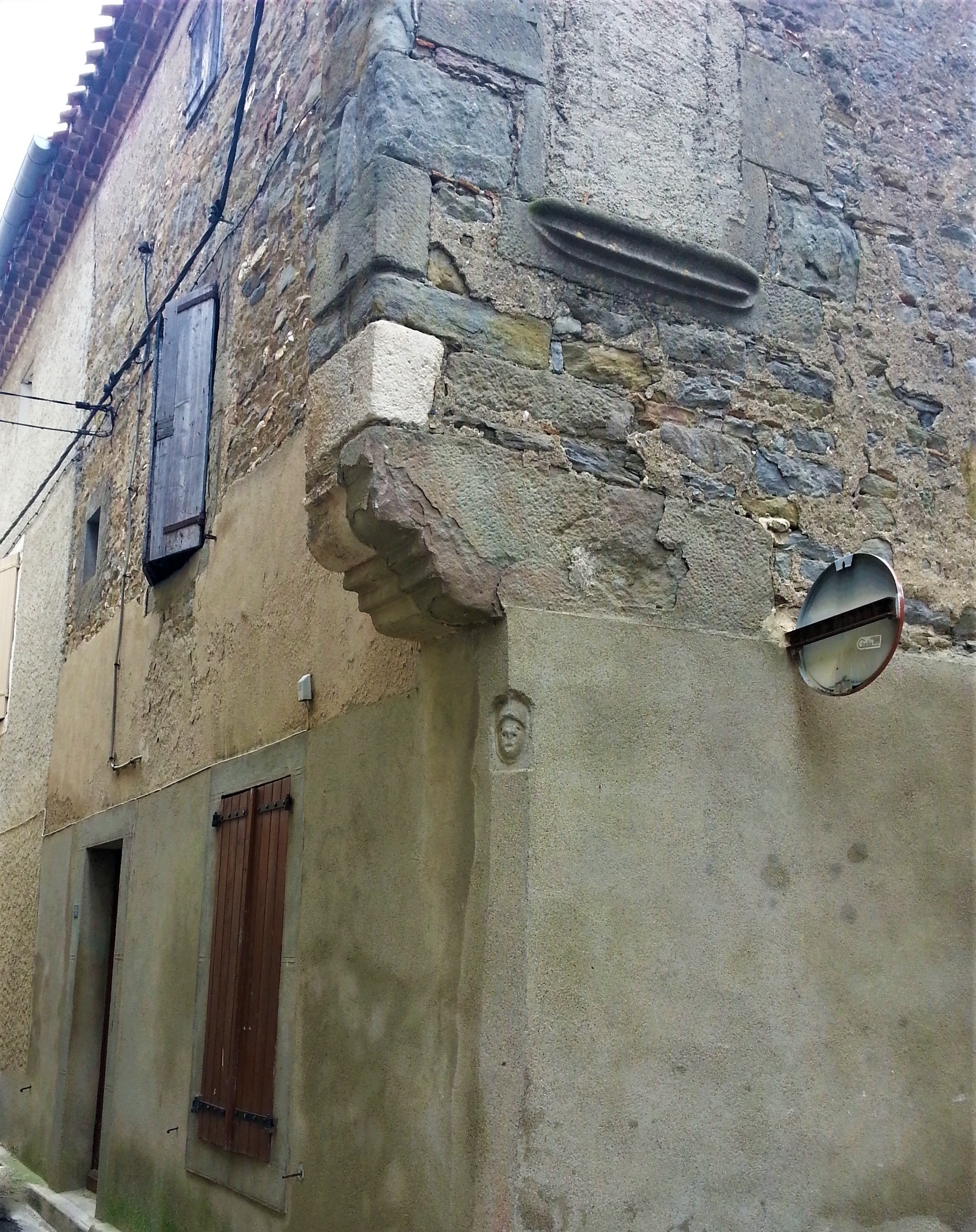 Ja enligt vad vår vän medeltidsarkeologen bedömer så är den äkta och han skriver om den i sin vetenskapliga artikel om Peyriac-Minervois (på sid 80). Den har dock som resten av första våningens fasad drabbats av en cementputs någon gång under 1900-talets andra hälft. Detta gör det svårt att bedöma vem det föreställer men en gissning kan vara en vaktpost som håller utkik för att varna folk i huset och i slottet i samma kvarter för yttre faror av alla de slag.