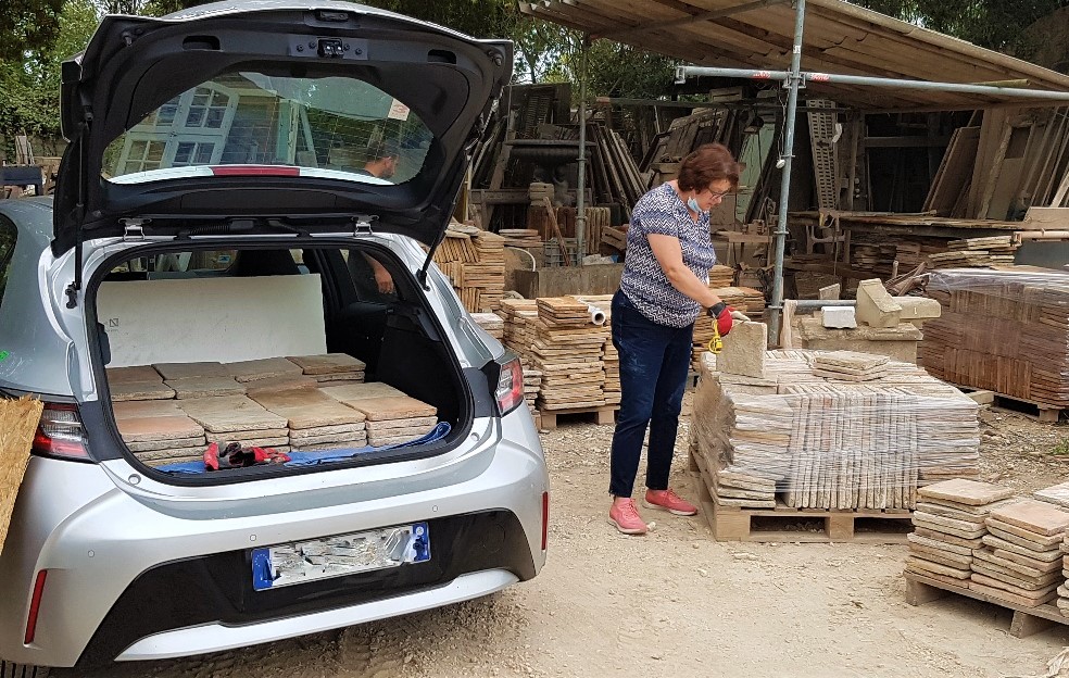 Efter att ha titta runt ett tag (se bildspel ovan) och fascinerats av allt det arbete som gjorts för att skapa alla dessa vackra ting ur sten var det dags att välja ut våra tomettes. Med lyxen att få välja ute de bästa ur högarna med 23 x 23 cm började vi plocka. Vi vågade lasta ett 90-tal vilket motsvarar runt 175 kg och är väl under bilens maxlastvikt.