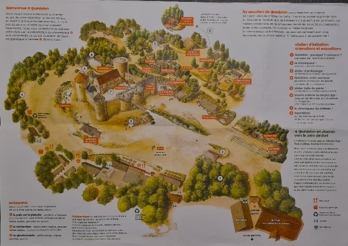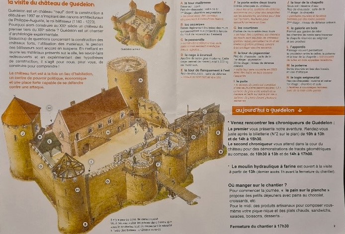 Direkt vid entrén möts man av en medeltida krönikör som ger en 20 minuters introduktion till projektet som helhet. I bakgrunden tronar Château Guedelon!