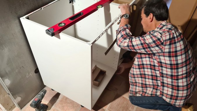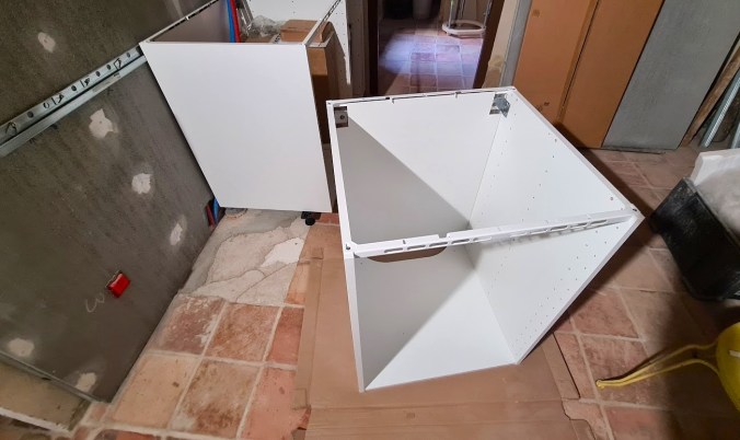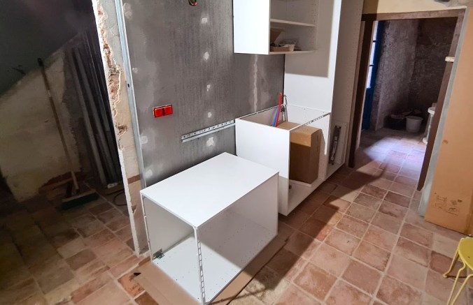 Ett av de viktiga stegen var att få köksbänken anpassad och på plats. Först dock en resa till Toulouse för att köpa in ytterligare ett skåp ur IKEAs Metodserie, det som skall husera diskmaskinen. Detta gick smidigt som vanligt och till min glädje noterade jag att detta skåp numera, som ett antal av deras produkter är Svanenmärkt, vilket ytterligare stärker mig i mitt val av köksstomme som ett tydligt steg i vår hållbara restaurering.