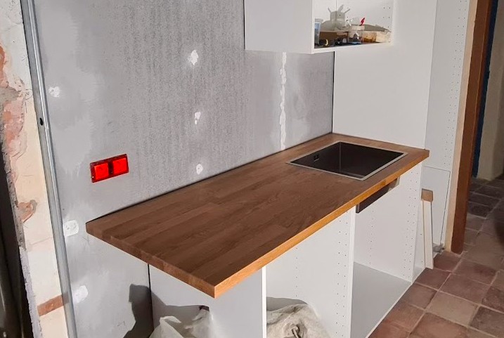 Återstår inkoppling av blandare och avlopp samt diskmaskin med mera men ändå så ger en köksbänk på plats en extra påtaglig känsla av att snart kan man flytta in.