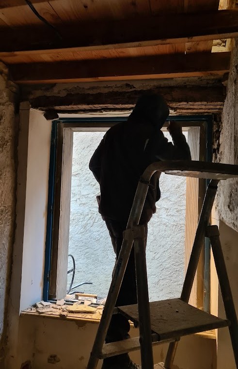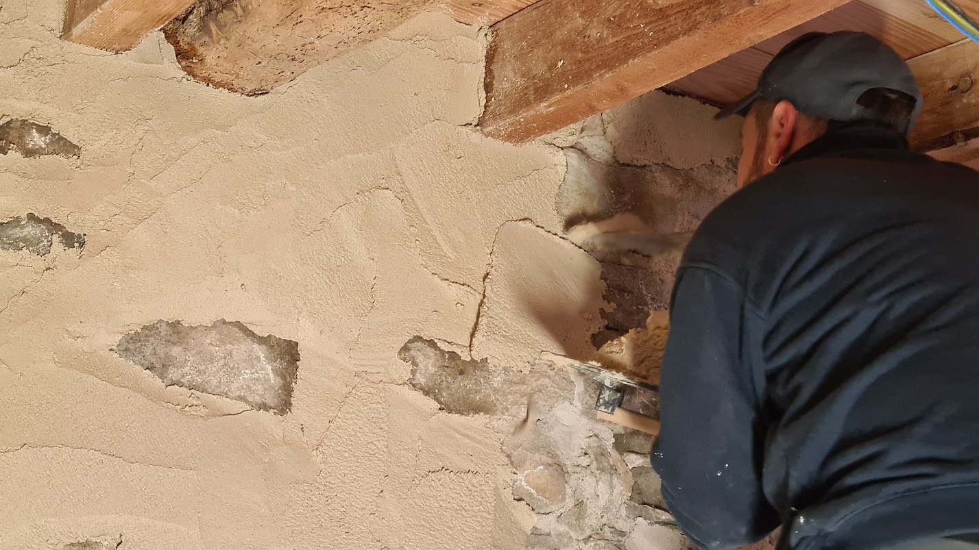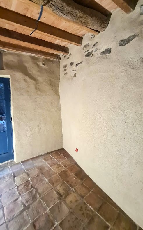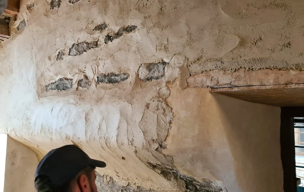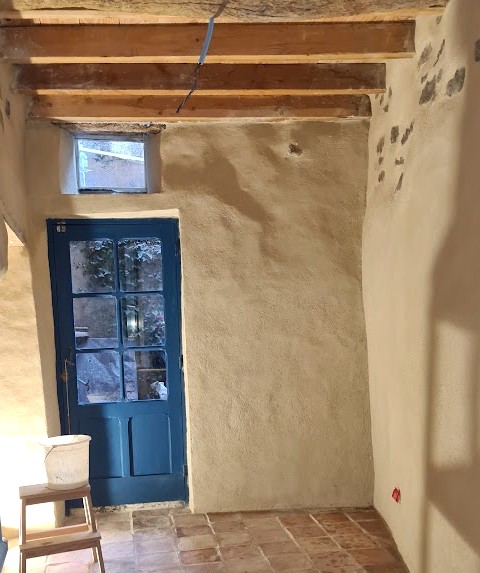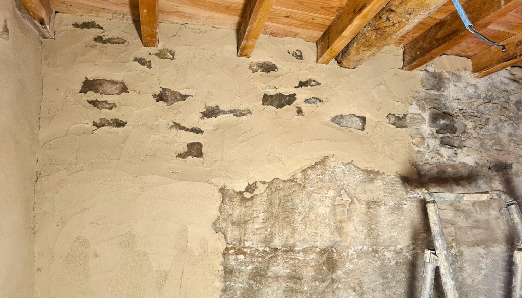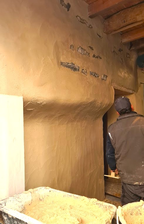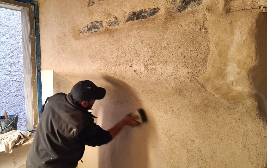 Men nu var det dags att få hjälp med att putsa väggarna i lilla kammaren på bottenvåningen. Naturligtvis med kalkbruk och lokal sand allt i lokal historisk tradition. Vi hade ju redan tidigare pickerat bort allt puts och gips på väggarna och fogat och lagat så att de nu direkt kunde putsas.
