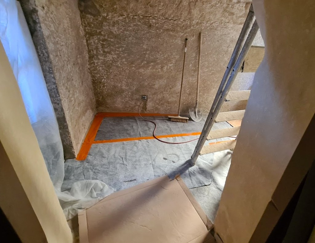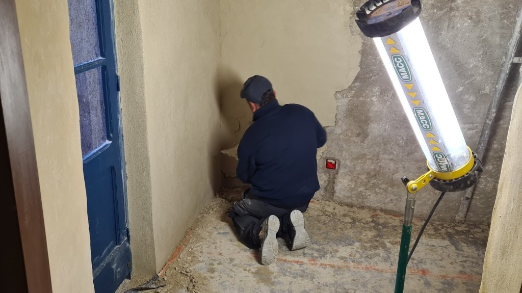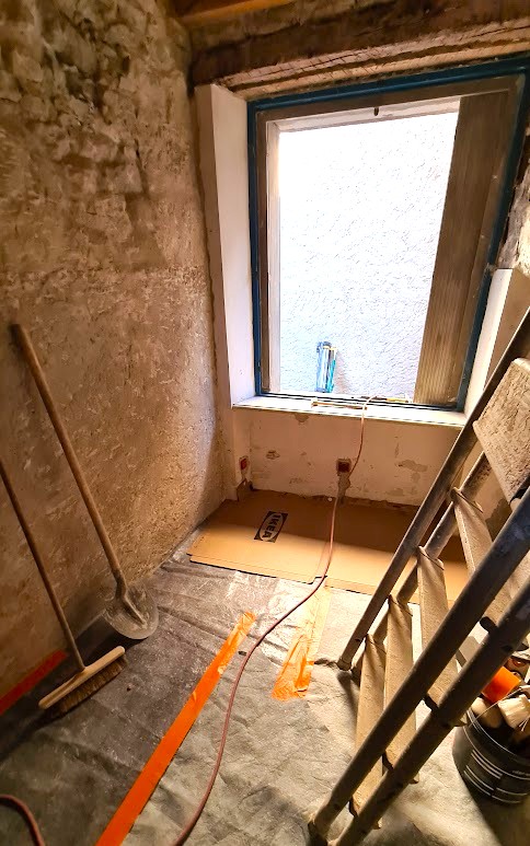 Dag två sopade vi av den nu torra väggen lätt för att få bort lösa sandkorn. Murarna fortsatt arbetet och strax efter lunch började rummet bli klart. De städade omsorgsfullt och plötsligt stod jag mitt i ett färdigt rum.