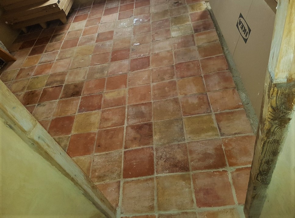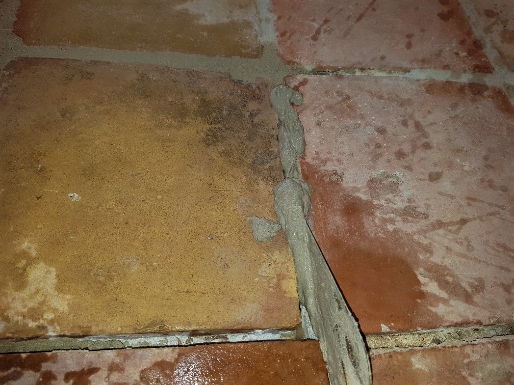 Så det som startade med rivning av PVC-matta avslutas nu med sista fogningen av tomettes med kalkbruk (1 del Chaux NHL 3,5 och 2 delar sable 0/2). Sista skedet i arbetet blir att sätta de få plattor som saknas i golv i skåp och nisch för att sedan mätta alla våra antika keramik klinkers med ekologisk linolja och sedan såpskura dem.