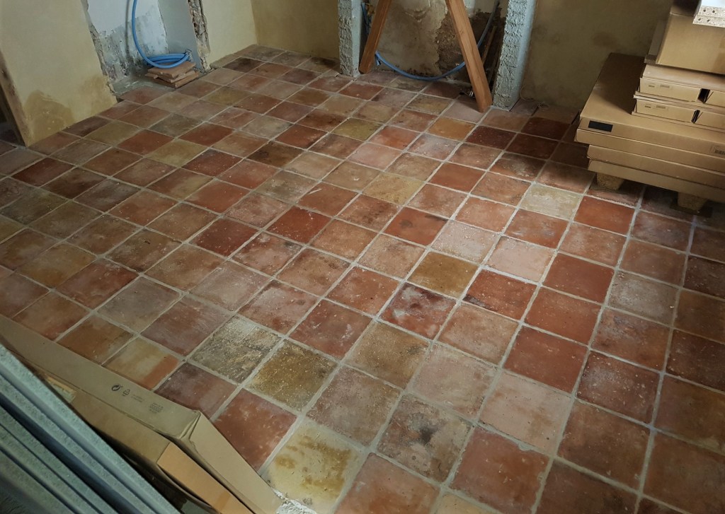 Blandningen av röda och gula nyanser av golvplattor är klassisk här i Aude och i vårt fall är de som så ofta från olika tidevarv, Helt klart har vi tomettes från de två senaste århundradena och kanske en och annan kan vara 1700-tal.