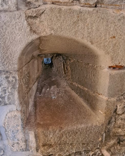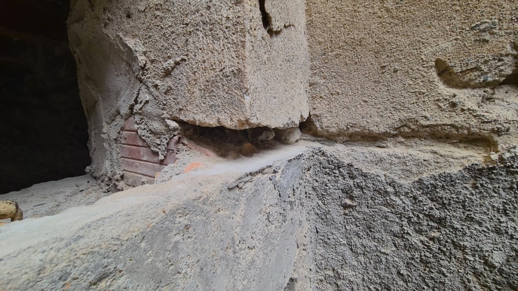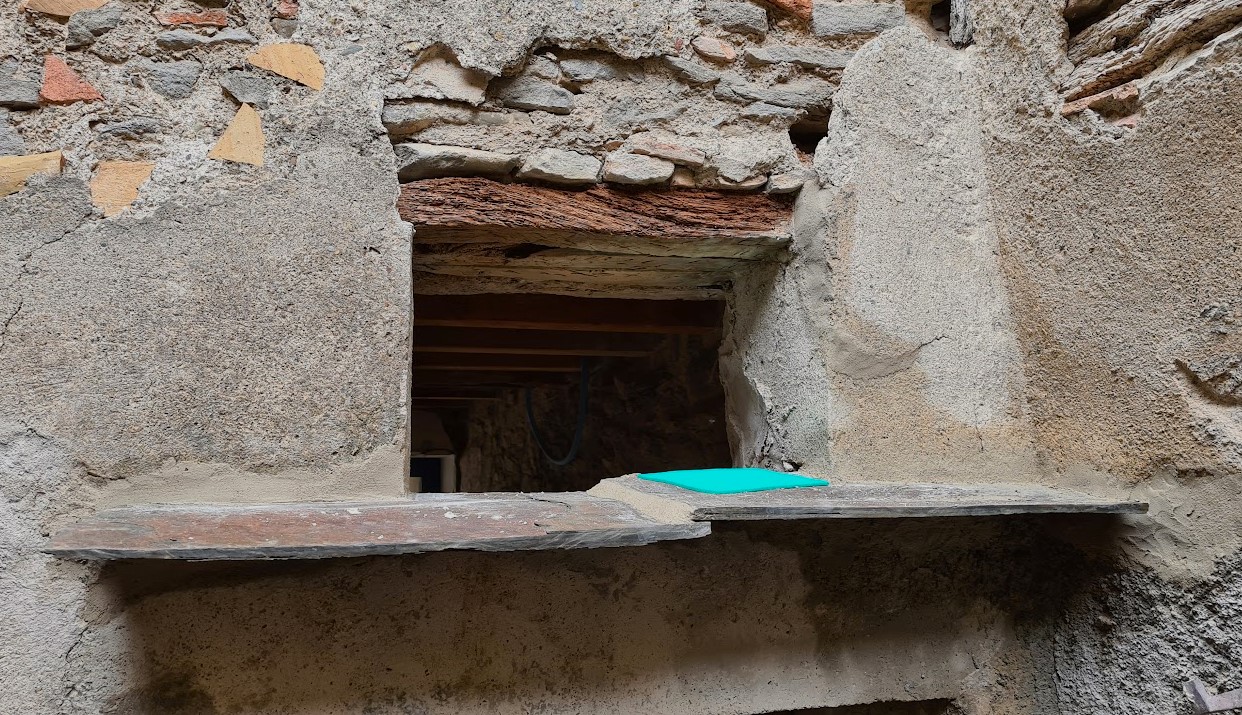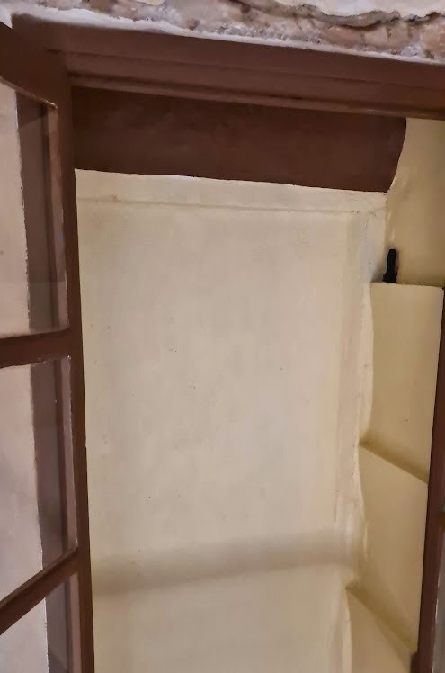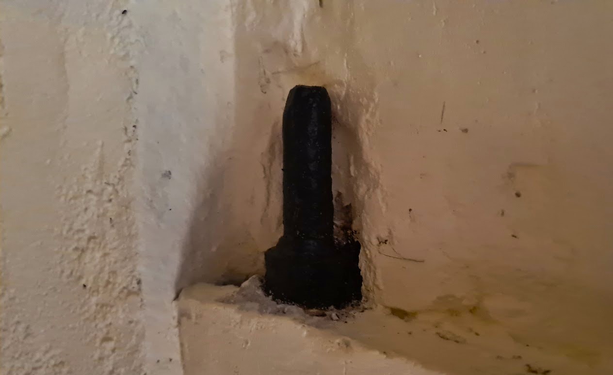 Detta lilla fönster som nog är ganska nygjort och därefter igenmurat bör ha kommit till under 1900-talet i samband med förstärkning av dörröppningen. En kvalificerad gissning är i samma skede som dörren monterades och den var som vi berättat tätad med en tidning från 1933 med en artikel om Hindenburg.