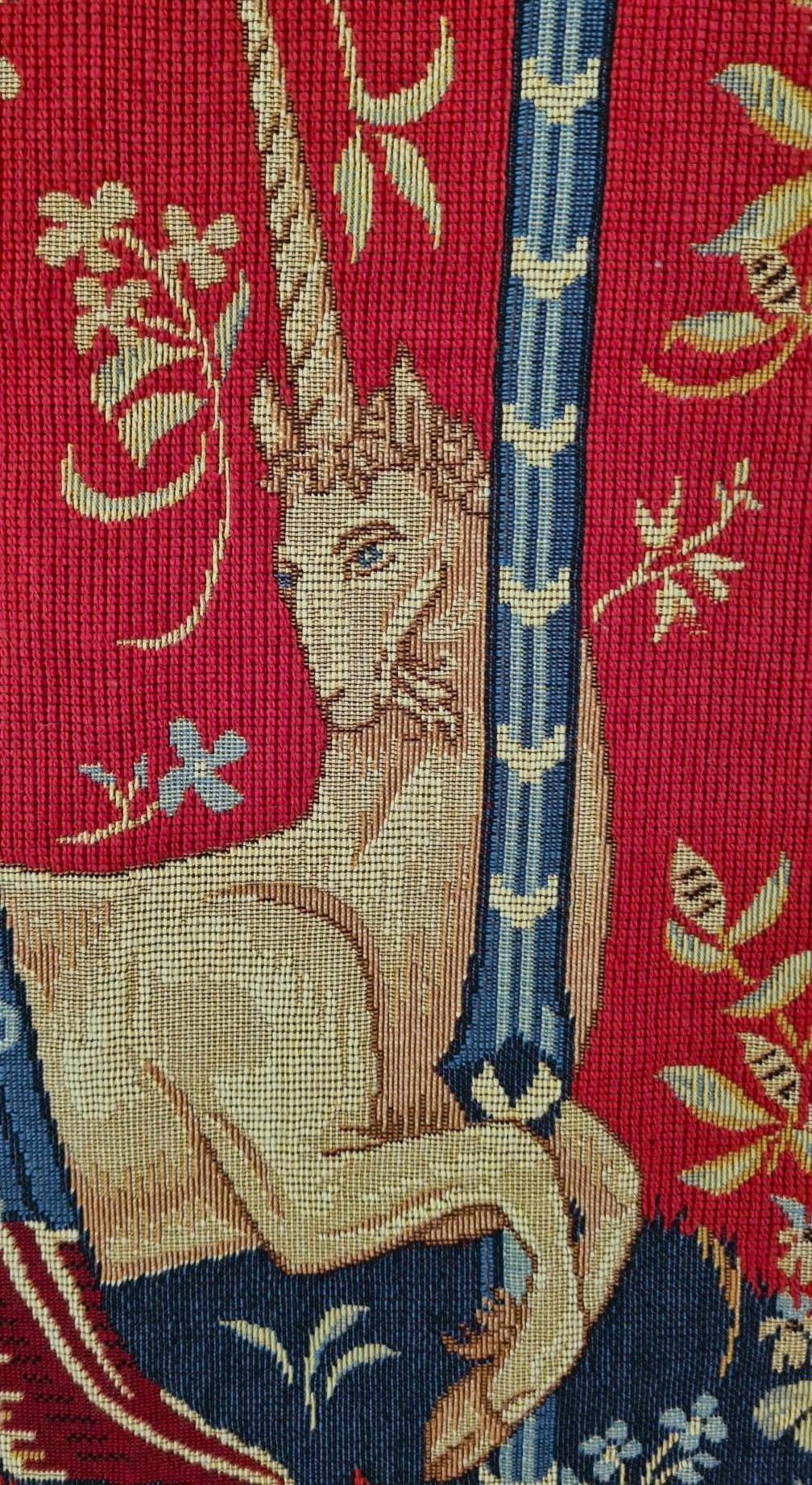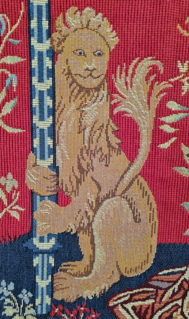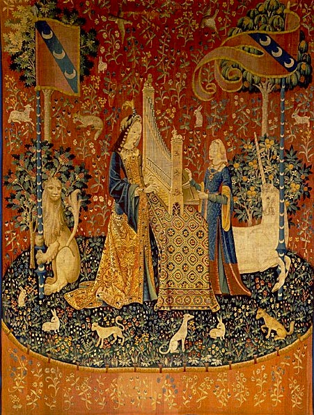 Vår gobeläng är den som beskriver ”hörseln” avbildande en scen där damen spelar orgel med sin tjänarinna som publik, uppvaktad av lejonet och enhörningen som standarhållare.