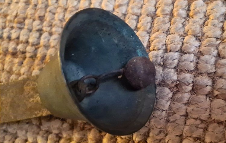 Klocka som troligen är i brons, hänger i en hållare av stål med inbyggd fjäder så att den ger ordentlig klämtning när man med en infästad kedja drar för att ringa på.