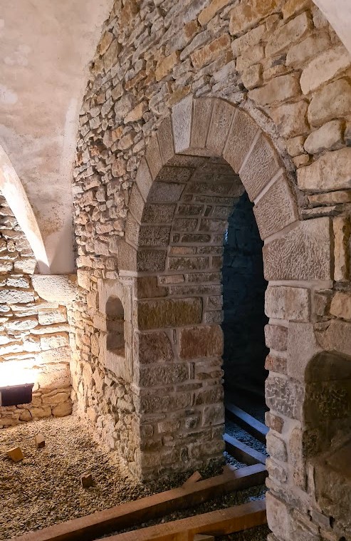 Dörren, som syns på nedan teckning ur Mme Coincy-Saint-Palais fina 60-talsbok Donjons et Castles au Pays des Cahtares, kunde till sist öppnas efter att ha gjort lite motstånd. Väl inne i vinkällaren som ligger i markplan, möttes vi av ett antal omsorgsfullt restaurerade medeltida rum.
