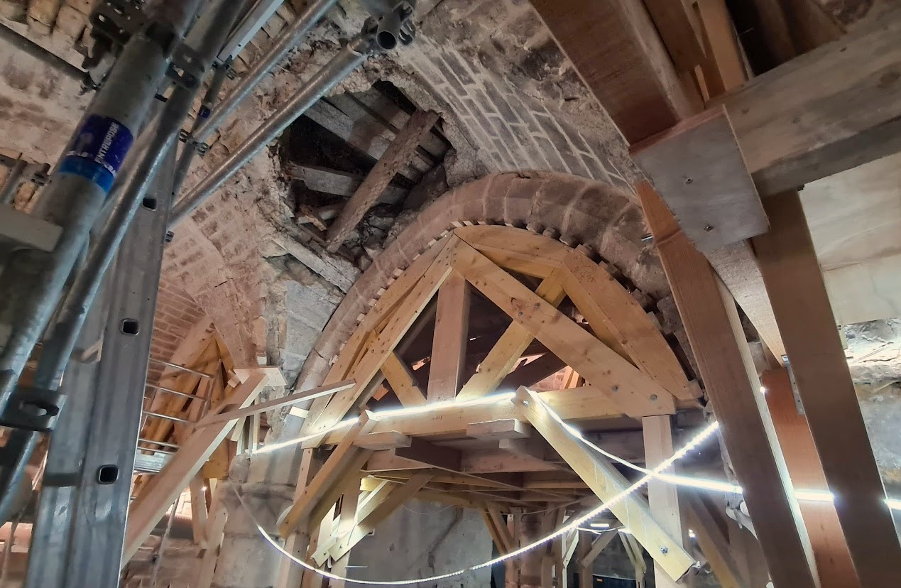 Ett imponerande valv har just slagits om med delvis nya stenar och med klassisk stödbåge i trä.