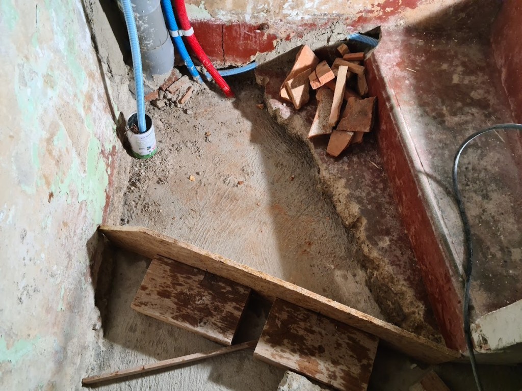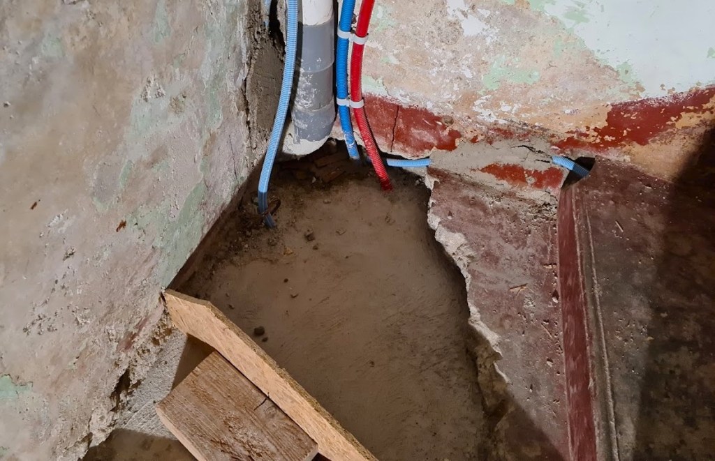 Inget lim i fogarna men däremot smidd spik som kommer att hålla ned plankorna mot golvbjälkarna samt utgöra ett dekorativt mönster av medeltida plankgolv.