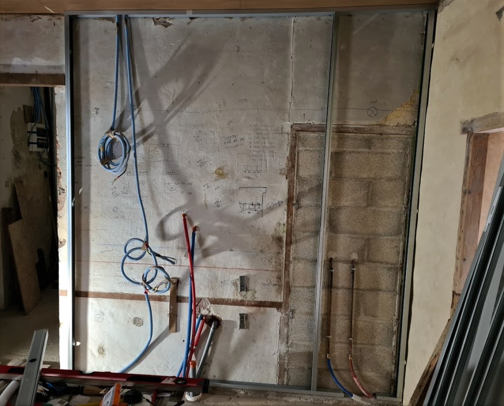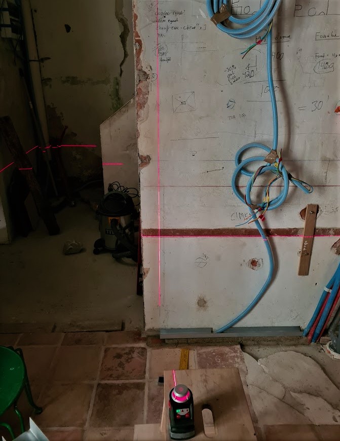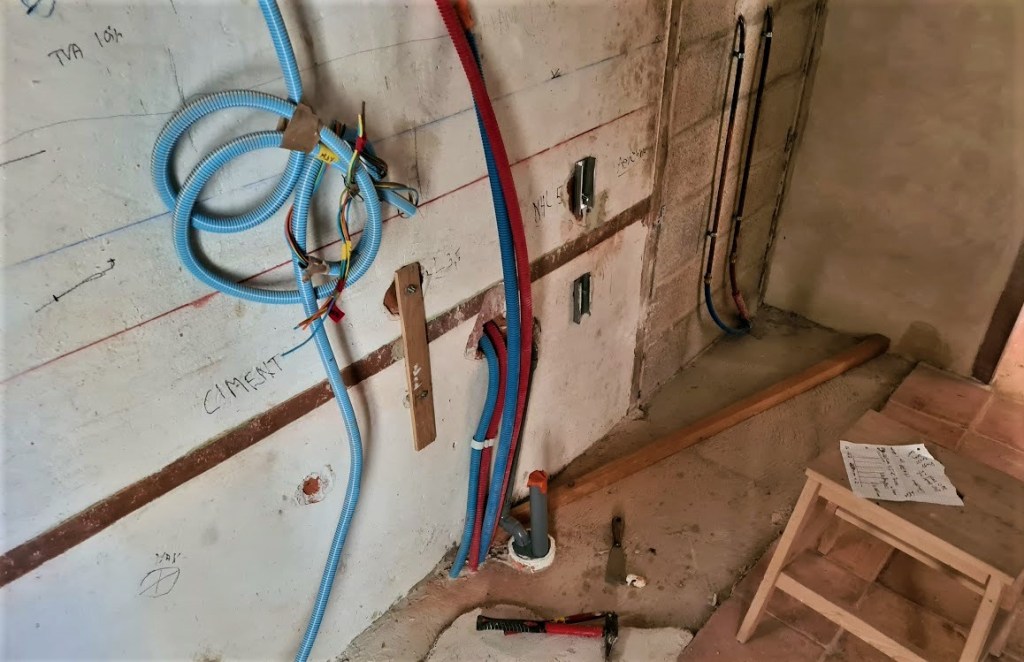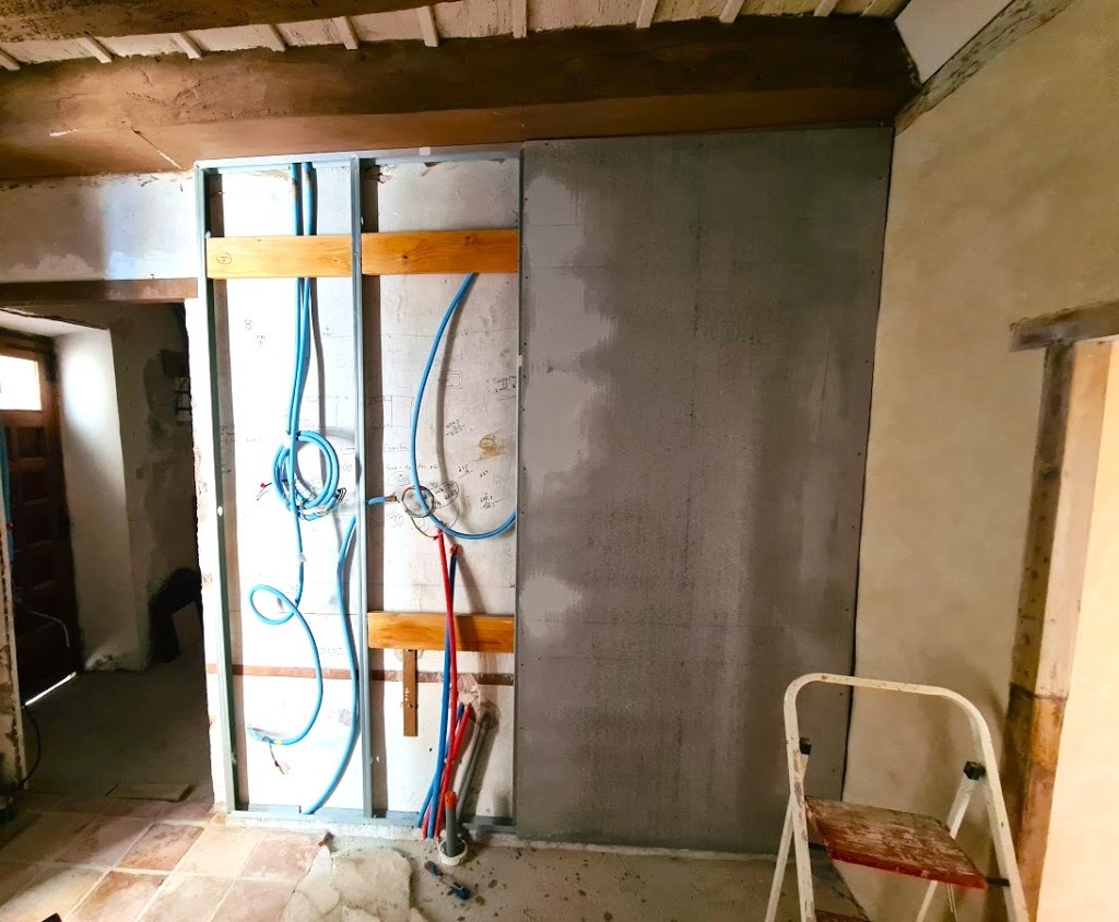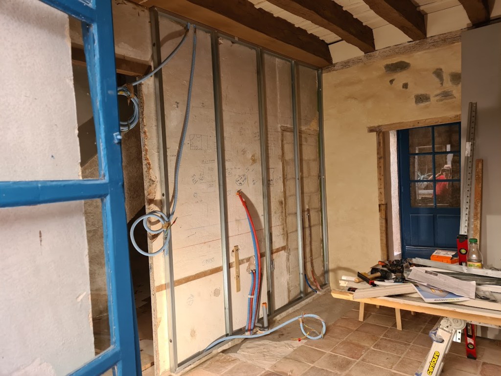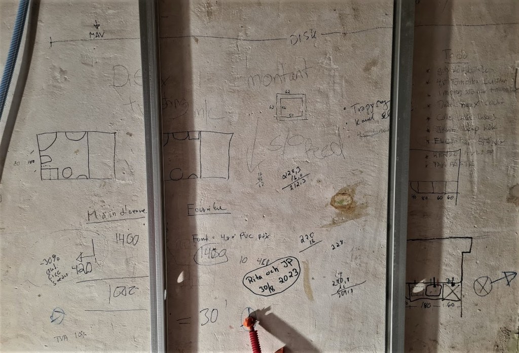 Åter i Peyriac var det dag att starta ett litet minisågverk på gatan och korta ned dem till 370 cm som är (med lite mån) det blivande golvets fulla längd i lilla kammaren en trappa upp. In med dem genom fönstret för lagring lutade mot väggen (på grund av längden) några dagar tills jag fick hjälp att lyfta upp dem.