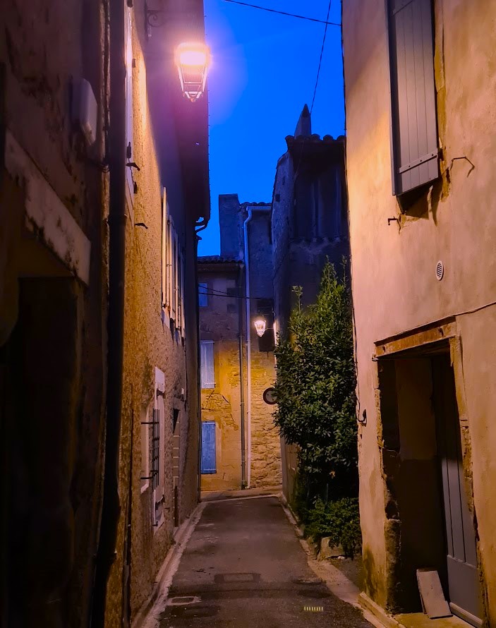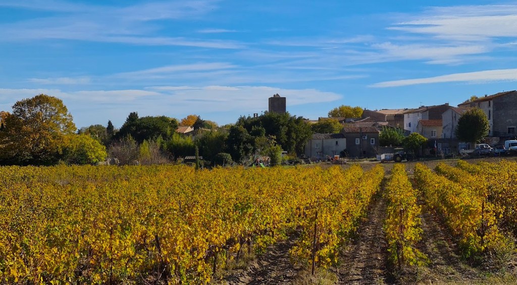 Vi avrundar med en vacker bild av vinfälten väst om Peyriac som kryper ända in mot byn. Nu i höstfärger och med vårt romanska kyrktorn i fonden som restes på 1100-talet medan kyrkan började byggas redan på 800-talet.
