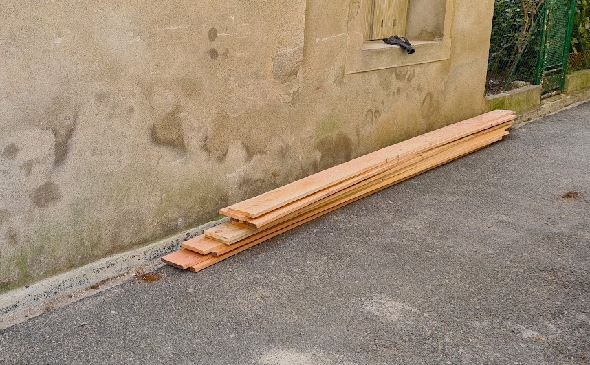 Det är av någon otrolig anledning mycket svårt att hitta ek på sågverken i våra trakter, trots att en stor del av skogsbeståndet förefaller vara ek i västra Occitanie. Hur som, douglasgran är ett ypperligt hårt och fint trä med inbyggd motståndskraft mot termiter bland annat. Plankorna jag beställt skulle vara 20 cm breda och 28 mm tjocka och i fyrameterslängder.