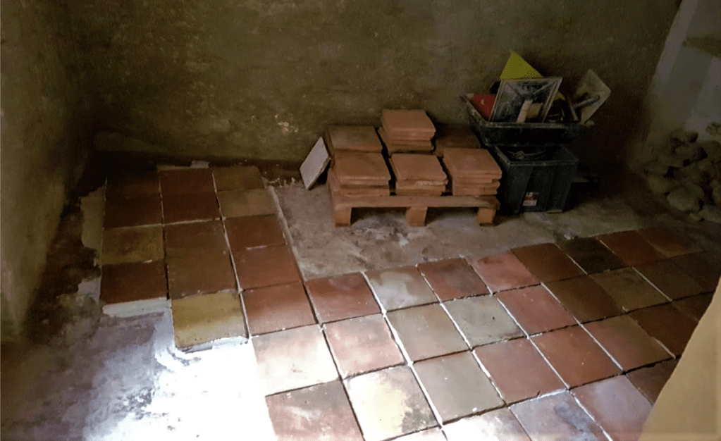 Golvrenoveringen har från början varit en medveten satsning på att kombinera traditionellt hantverk och robusta material, för att skapa både stabilitet och en medeltida känsla i rummet.