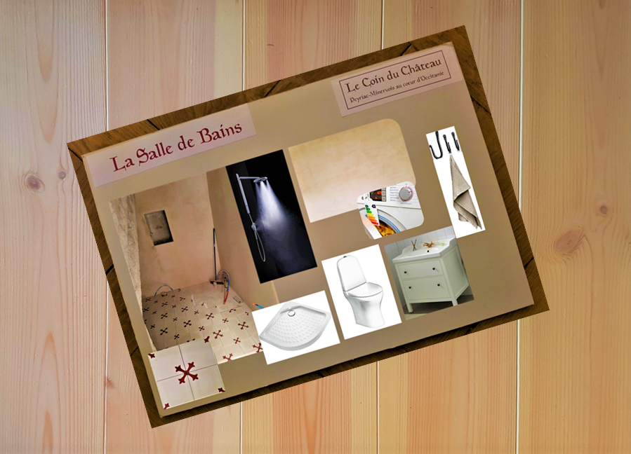 Vårt tredje mood board blir det för badrummet. Som vi berättat om i många tidigare episoder (sök gärna på badrum eller salle de bains i sökfunktionen ovan till höger) är ju detta lite av det svåraste att hålla en medeltida känsla på. Rinnande vatten fanns och visst tvättade man sig men dusch och vattentoalett måste vi ju tillstå är tillkomna de senaste 100 åren.
