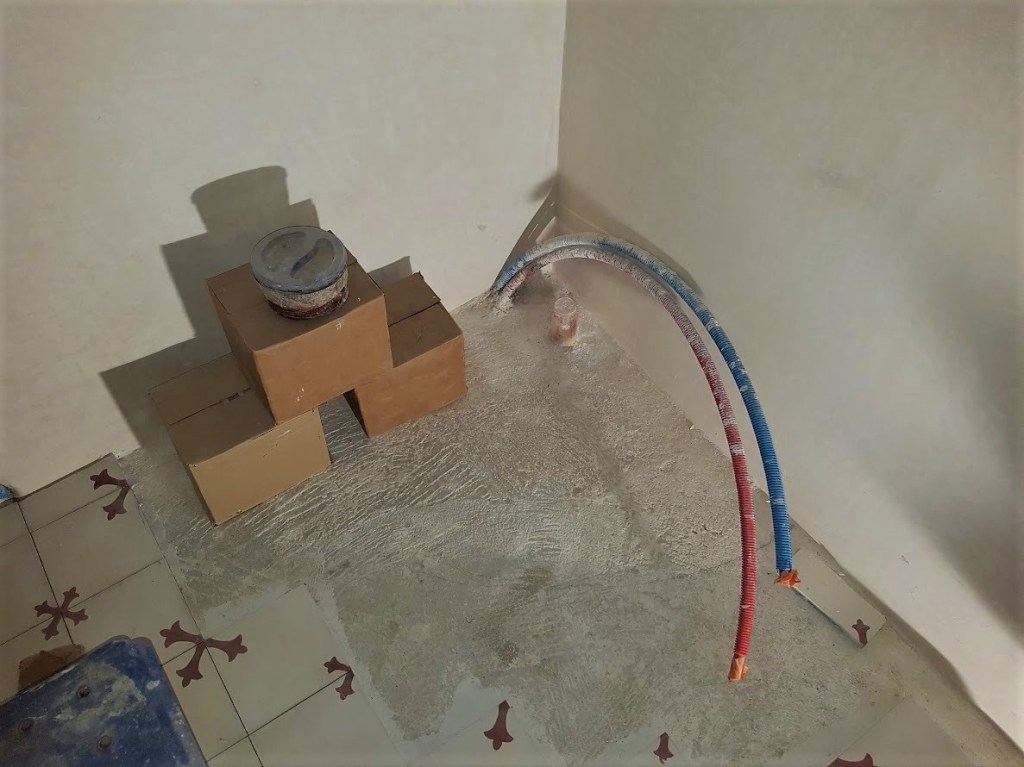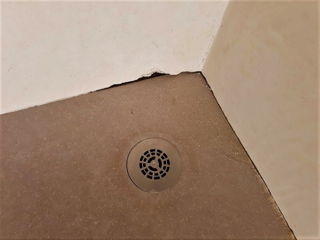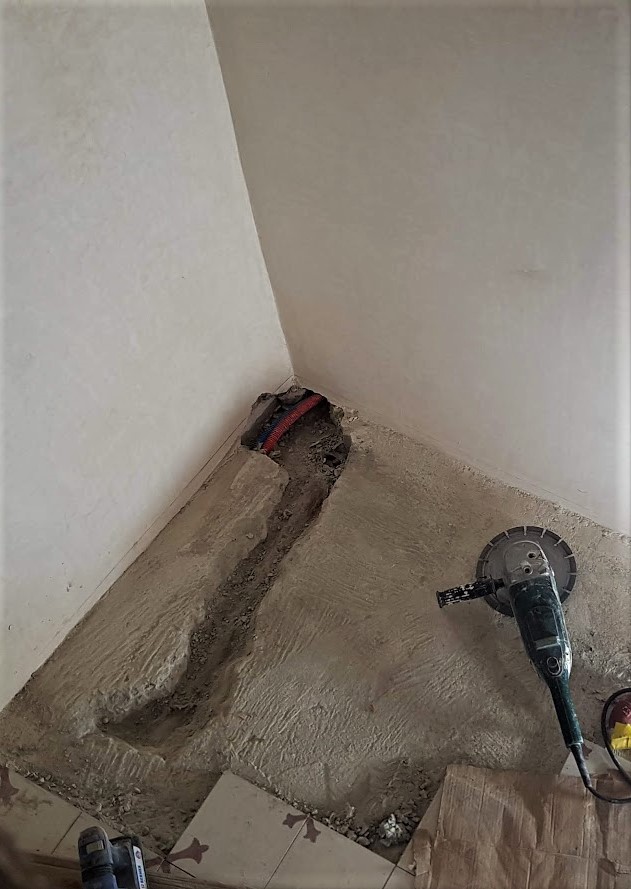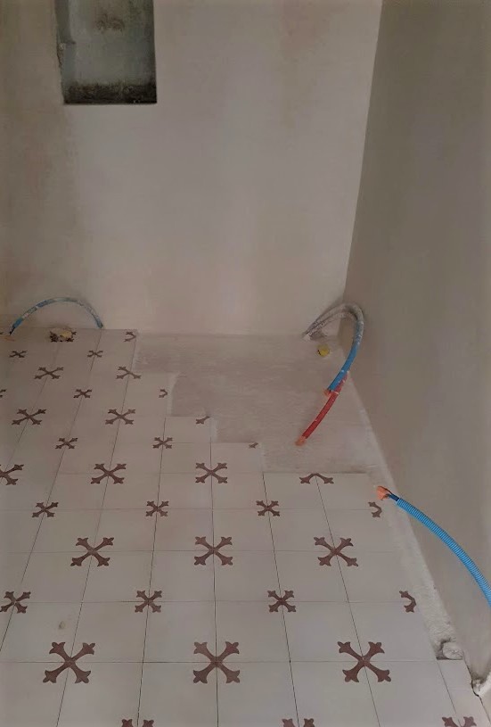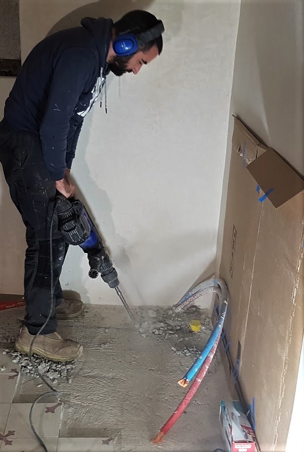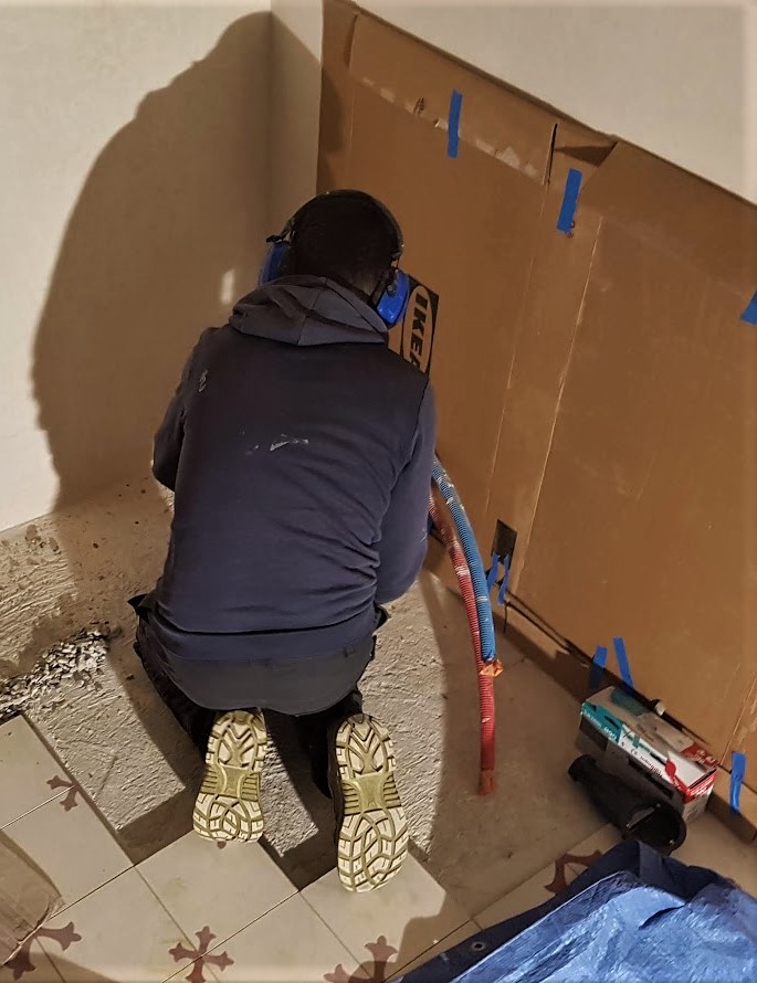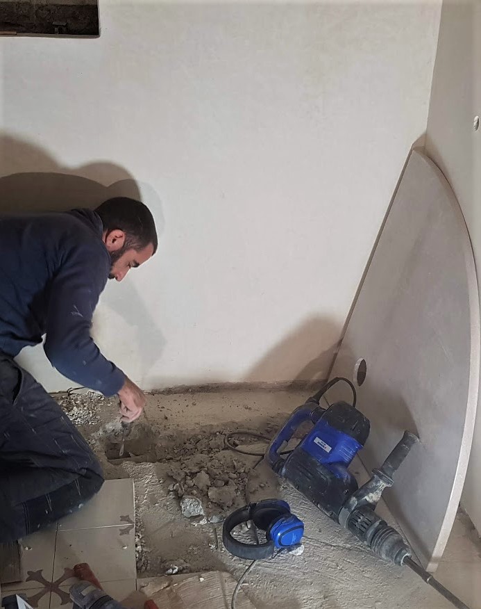 Först uppbilning för anslutning av den specialtunna avloppsbrunnen och redan då började man bli nervös för skador på våra fina tadelaktväggar. Värre blev det när vi insåg att vi behövde bila in spår i väggarna för att få receveuren på plats vattentätt. Men det gick fint och ganska snart hade vi ett fungerade duschgolv. Följande bildserie ger en överblick…