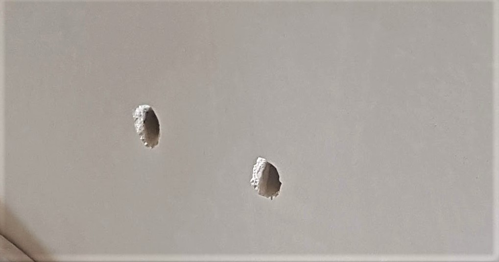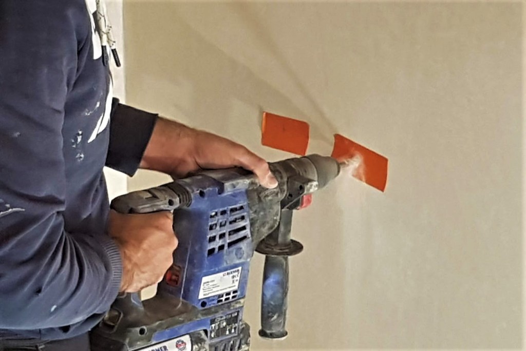 Borrhammaren grep sig an tadelaktväggen för att göra hål för rören och jag höll andan. Men även hör gick det galant med tejp som skydd, start med liten borr och sedan ökande till större dimension. Med den eleganta lösningen att ha en dubbelvägg i köket så får vi ett ”schakt” med plats för all el och vatten. Lite klassiskt rörmokararbete och så var duschen på plats och inkopplad. Bilderna nedan visar utvecklingen…