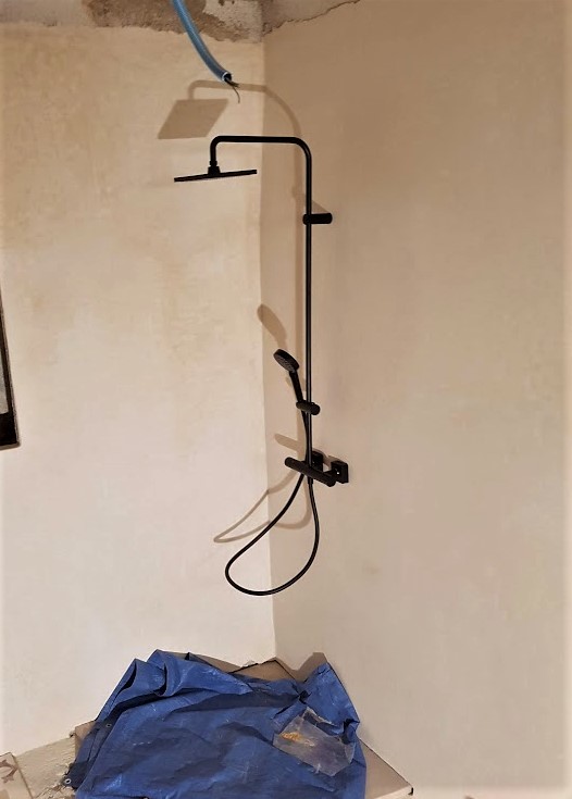 Hursomhelst, vår ambition har varit att ta fram en modern hypereffektiv dusch med medeltida anstrykning och nu var det dags för montering av såväl duschgolv som duschset som tillsammans med våra fina tadelaktväggar, och framöver ett par välvda glasdörrar, kommer att utgöra duschen.