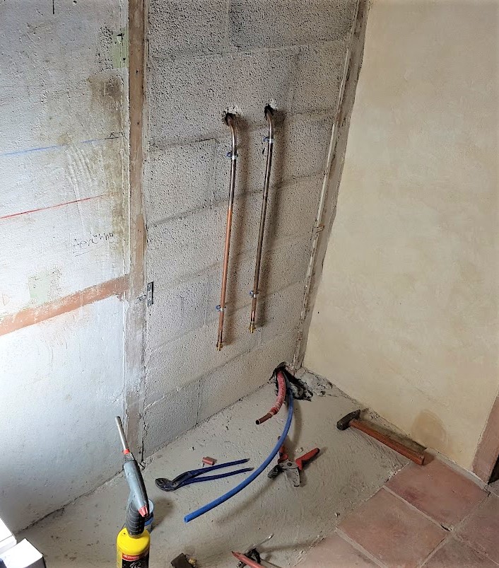 08.30 på morgonen var de båda bröderna från den lokala välrenommerade rörmokarfirman på plats och fortsatte det arbete som deras far påbörjat 2017 med att installera vårt nya avlopp i gjutjärn. Nu var det dags att ansluta till detta.
